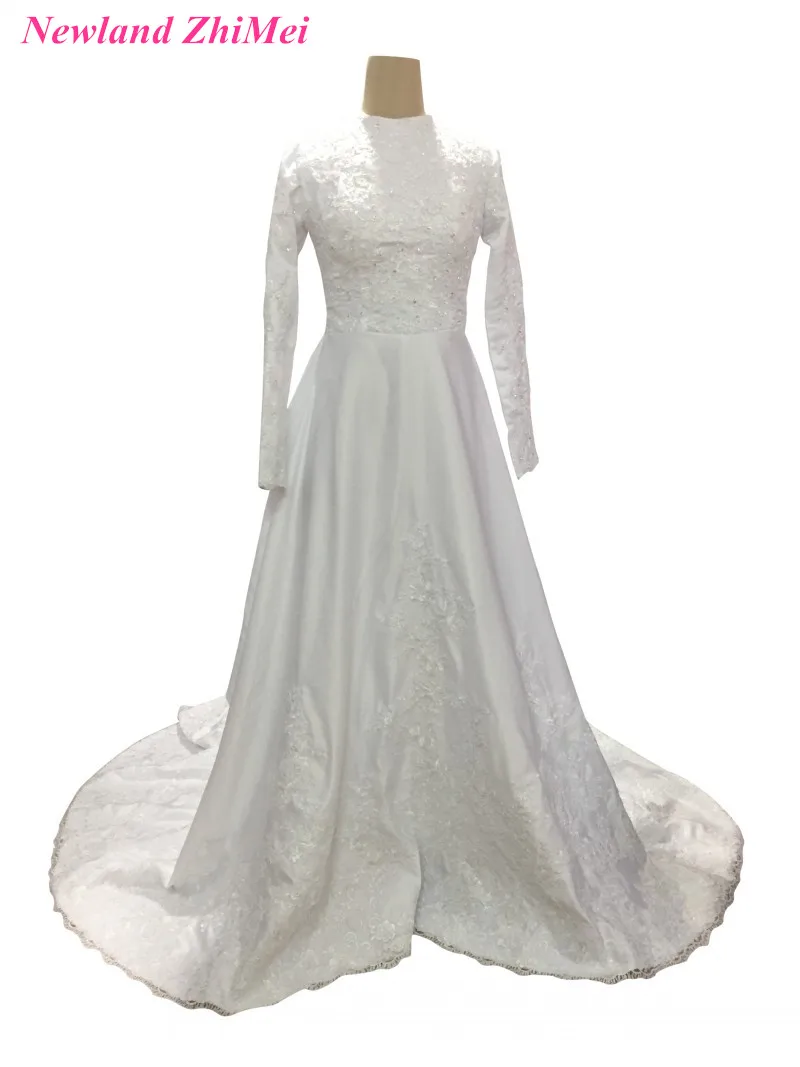 High Neck Long Sleeve Arabic Hijab Muslim Wedding Dresses 2019 Romantic Appliques Lace White Bridal Gowns Court Train Abiti Da Sposa Custom Black
