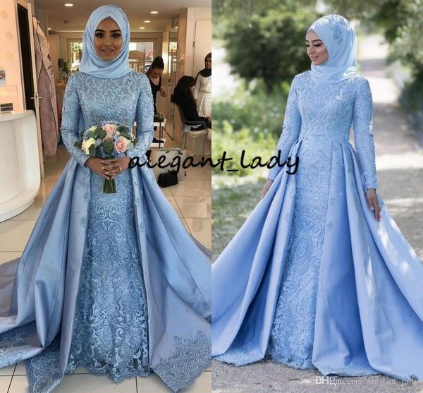 Discount Sky Blue Muslim Country Garden Wedding Dresses With Overskirt 2019 High Neck Long Sleeve Lace Stain Dubai Arabic Hijab Wedding Gown Latest
